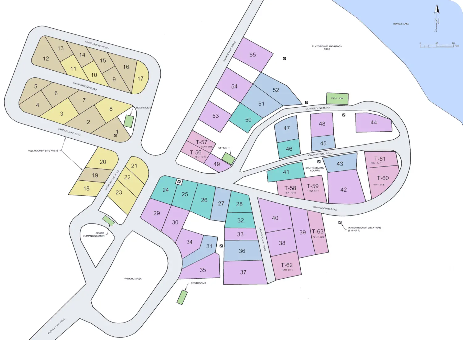 Full hook-up with 50 amp service.Full hook-up with 30 amp service.Electric-only sites with 50 amp service.Electric-only sites with 30 amp service.Electric-only sites with 20 amp service.Tent sites with no electricity.